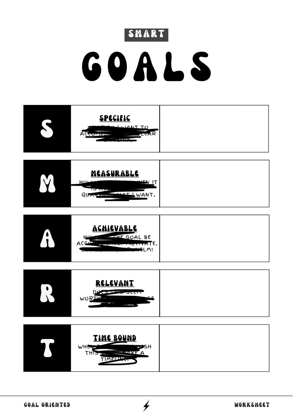 A worksheet page for creating SMART goals! Specific, Measurable, Attainable, Realistic, Time-Oriented! Created by an experienced professional clinical counselor and psychotherapist with experience working with severe mental illness and crisis.